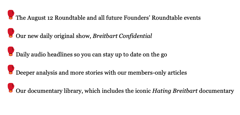 It’s not too late to join the Fight Club and become a Founding Member, which gives you VIP access to this and all future Founders’ Roundtable events. You just need to join as an annual member at the “Middleweight” level or above by midnight on Sunday, August 10. After you join, you will receive an email directly from Breitbart News so that you can register for the August 12 Event.