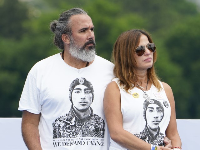 Manuel Oliver and Patricia Oliver, the parents of Joaquin Oliver, one of the victims of the 2018 mass shooting at Marjory Stoneman Douglas High School in Parkland, Florida, listen as David Hogg, a Parkland survivor, speaks during the second March for Our Lives rally in support of gun control, Saturday, June 11, 2022, in Washington. (Manuel Balce Ceneta/AP)