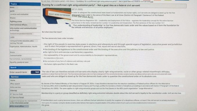 One passage shared from the internal police intranet stated: “If membership in such a party becomes known, there are sufficient actual indications that justify the suspicion of a disciplinary offense, at least if the officer is actively involved in such a party.”