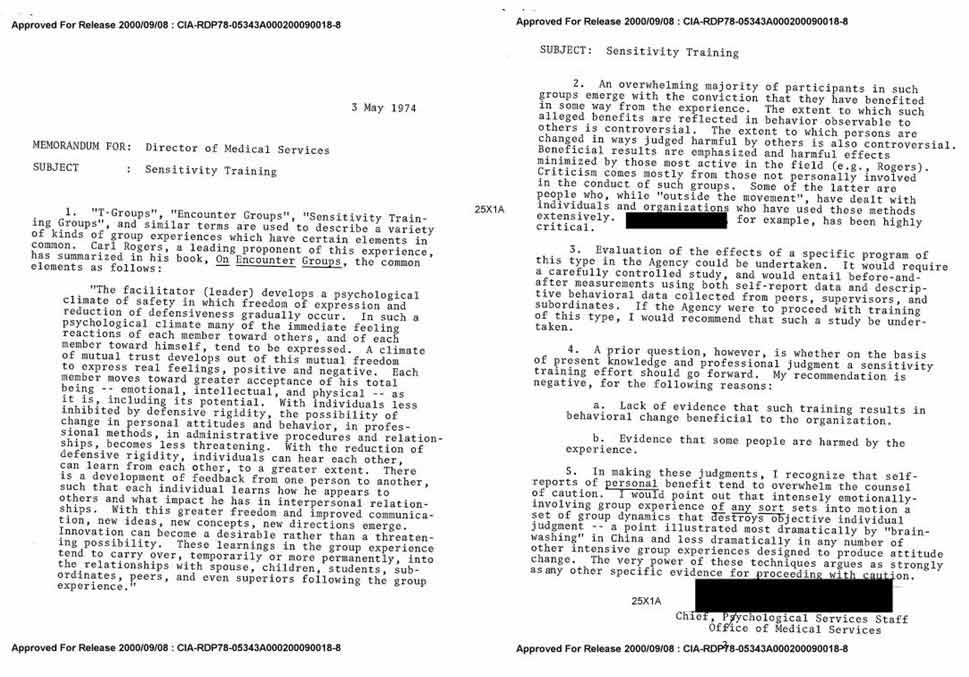 “A prior question, however, is whether on the basis of present knowledge and professional judgement a sensitivity training effort should go forward. My recommendation is negative…I would point out that intensively emotionally-involving group experience of any sort sets into motion a set of group dynamics that destroys objective individual judgement – a point illustrated most dramatically by “brainwashing” in China and less dramatically in any number of other intensive group experiences designed to produce attitude change. The very power of these techniques argues as strongly as any specific evidence for proceeding with caution.” – CIA Memorandum