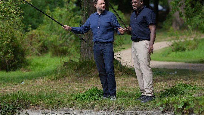 SEVENOAKS, ENGLAND – AUGUST 8: U.S. Vice President JD Vance fishes with British Foreign Secretary David Lammy at Chevening House on August 8, 2025 in Sevenoaks, England. (Photo by Kin Cheung – WPA Pool/Getty Images)