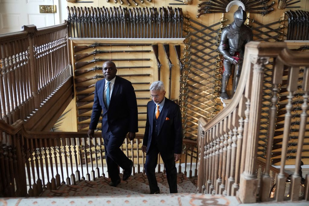 Chevening’s famous hall, the walls of which are covered in the swords, muskets, and pistols of a disbanded regiment that form trophies. Pictured at the time of British Foreign Secretary David Lammy hosting his Indian counterpart Subrahmanyan Jaishankar, ahead of a bilateral meeting on March 5, 2025. (Photo by Alastair Grant / POOL / AFP)