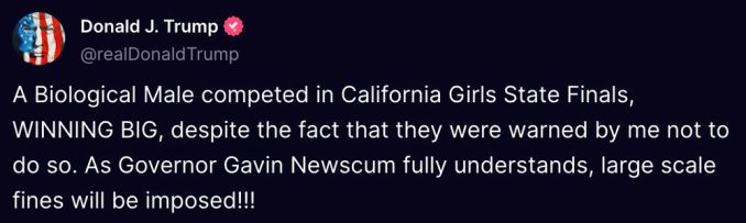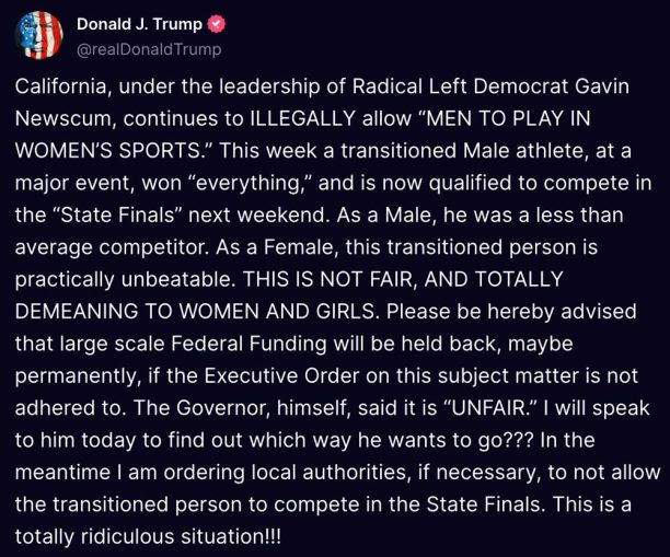 “A Biological Male competed in California Girls State Finals, WINNING BIG, despite the fact that they were warned by me not to do so,” Trump said in a post in Truth Social.