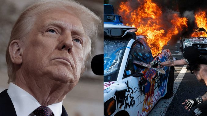Trump cited disturbing footage showing individuals using broken pieces of sidewalk to attack law enforcement and military personnel.
